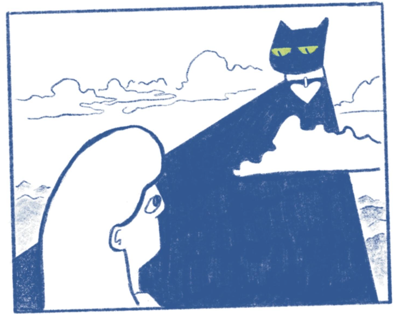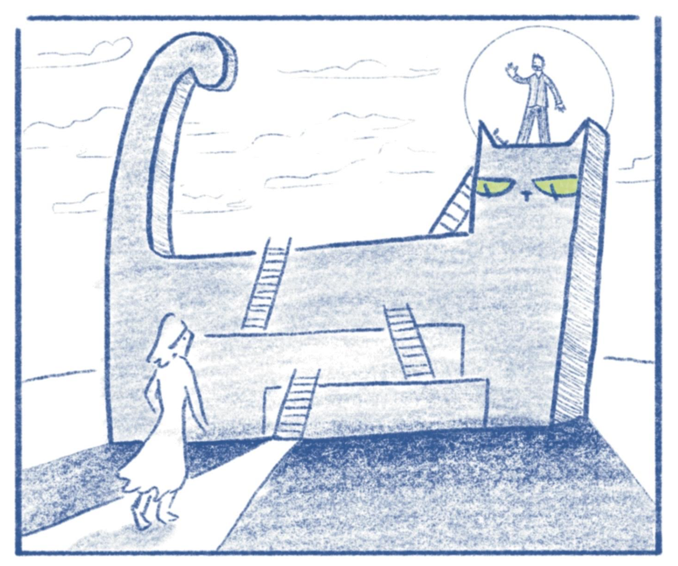 For the final illustration, I wanted to show an uneasy alliance of three parties: she loves him, he loves his cat, and maybe she and the cat can make this work.